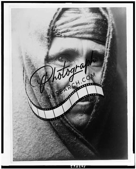 Summary: Portrait of Navajo man, head-and-shoulders, facing front, rag headband, blanket over shoulders.