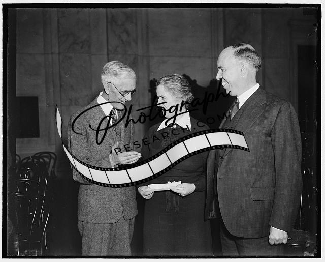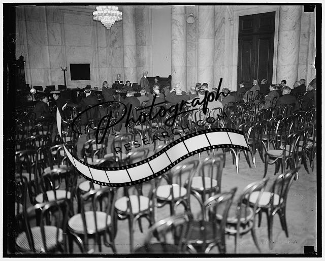 Title: Striking Seamen see Secretary Roper. Washington, D.C. Jan. 18. A committee of striking seamen from Baltimore, Philadelphia, New York and Boston, called on Secretary of Commerce Roper today to protest against provisions of the Copeland Saftey-At-Sea Act. In the photograph, left to right, seated: Patrick B. Whalen; Al Lannon; Joseph Curran; R.M. Jones; standing, left to right: S.M. Blinken, Ralph Emerson, and Paul Rothman