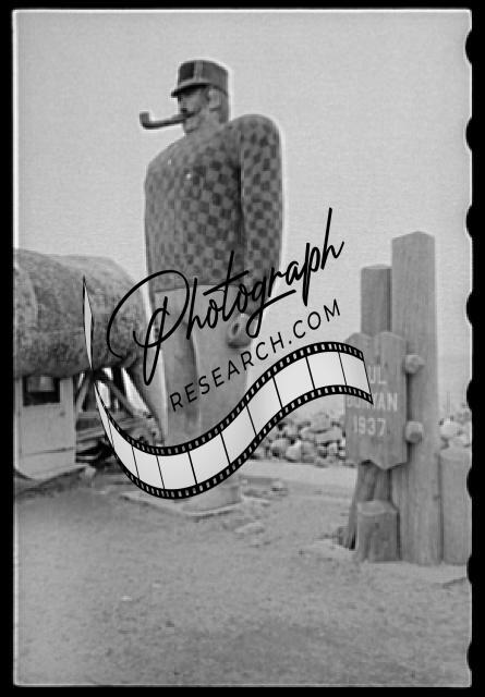 Paul Bunyan atop gas station,Bemidji,Minnesota,MN,September 1939,John Vachon