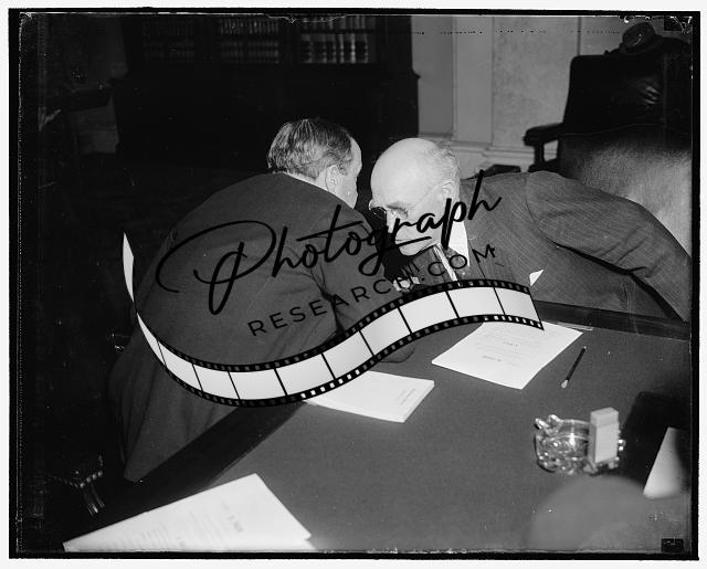 Paul V McNutt,Harry H Woodring,pointing,desk,office,flag,Washington DC,1938