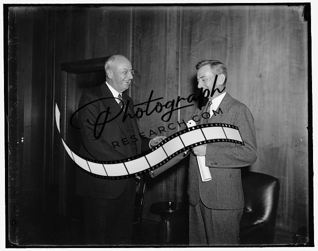 Title: Paul Whiteman favors Dickstein Bill. Washington, D.C., March 15. Paul Whiteman told the House Immigration Committee this afternoon that he favored the Dickstein Bill to permit foreign artists and musicians on a reciprocal basis to enter this country except in cases where there are no stars available. In the picture from left to right are: Paul Whiteman, Representative Caroline O'Day, Representative Samuel Dickstein and Representative James H. Gildea