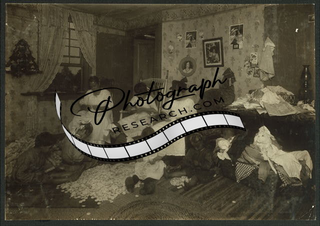 Stringing buttons in crowded home,Williamsburg,Massachusetts,Lewis W. Hine
