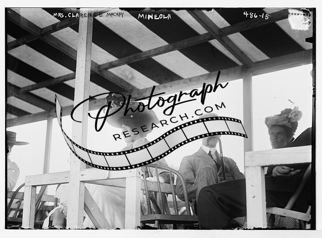 Mrs. Clarence MacKay,in stands at Mineola race track,man holding cane
