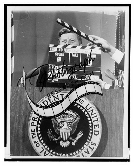 A production slate board eclipses President John F. Kennedy's face below his nose, as he stands behind lectern bearing the presidential seal, during taping of television appearance