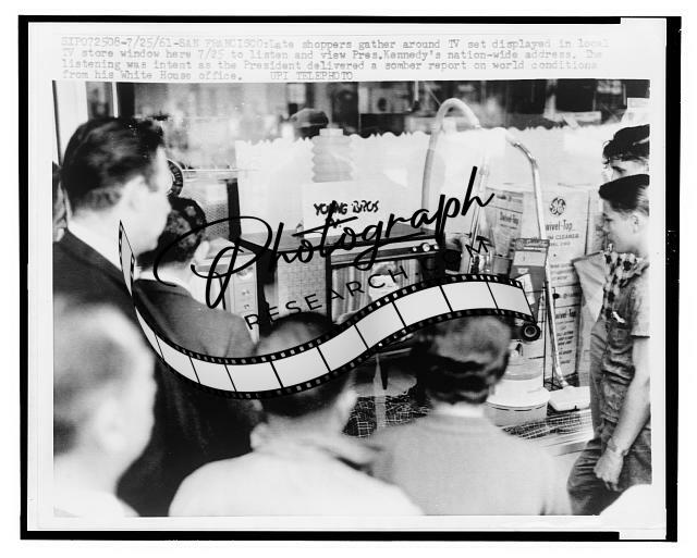 Shoppers gather around a television in a San Francisco store as President John F. Kennedy addresses the nation from his White House office