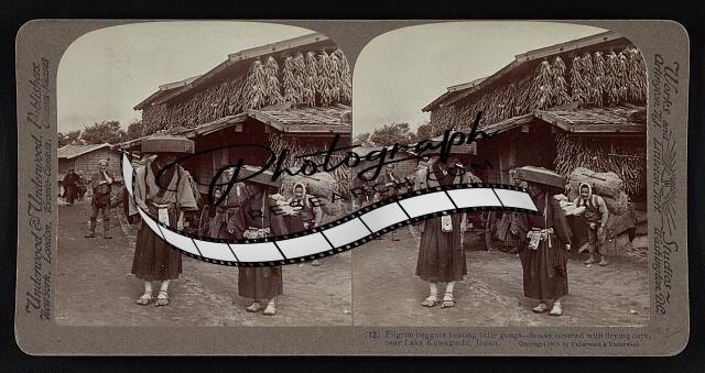 Pilgrim beggars beating little gongs-house covered with drying corn, near lake K