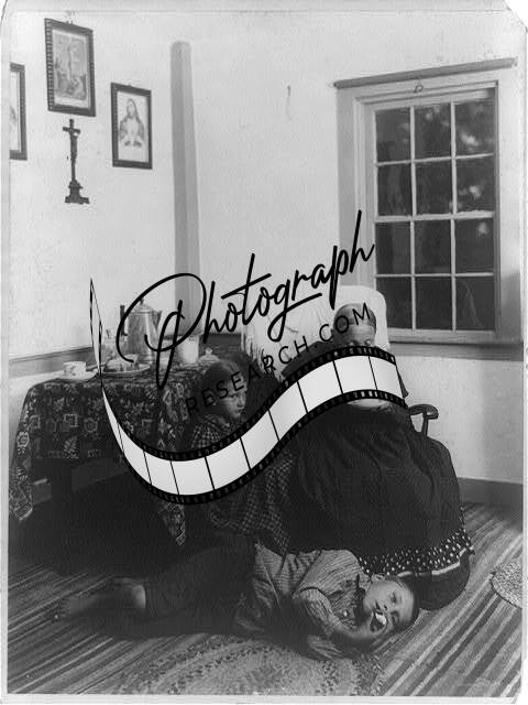 Kept In,c1896,Old Woman sipping from spoon,girl eating bread,boy lying on floor