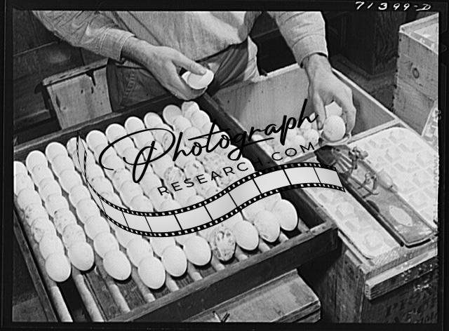 Title: Petaluma, Sonoma County, California. Putting eggs into an incubator at a hatchery. In 1878, Lyman Ryce, a young Canadian, decided that the country around Petaluma was well adapted to poultry raising and egg production, and founded the industry. He conceived the idea of artificial incubation and lived to see his incubators and brooders used throughout the world