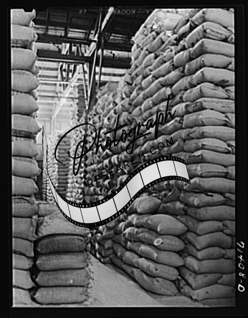 Title: Petaluma, Sonoma County, California. Loading sacks of chicken feed onto truck at a feed mill
