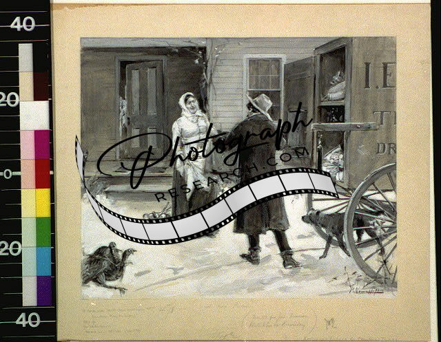 Backwoods Santa Claus exchanging Christmas things for Turkeys,1894?,Peddler