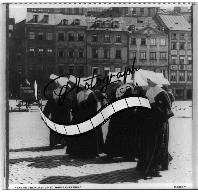 Nuns on their way,white hats,St John's Cathedral,plazas,Warsaw,Poland,1942