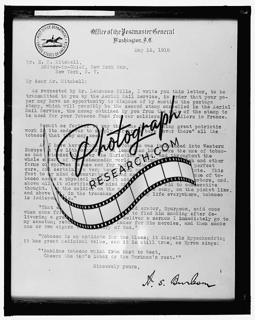 PHOTO ONLY of NEW YORK SUN. FIRST AIR MAIL LETTER,1918,Harris & Ewing