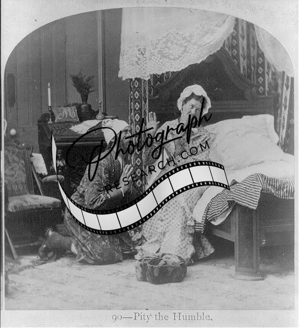 Pity the humble,c1870s,Man on Knees beside woman sitting on bed,begging