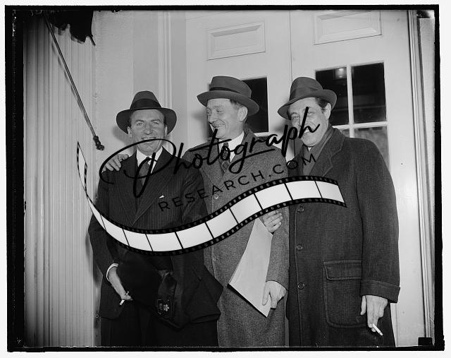 Title: Wife of CIO Head attends Mine Workers Convention. Washington, D.C., Jan. 25. Mrs. John L. Lewis, wife of the CIO Head and President of the United Mine Workers, listens attentively as her husband delivers the opening speech at the 35th annual convention of the UMWA today. Lewis declared that labor will fight wage and price reductions during the current business decline. Philip Murray (left), Chairman of the organizing committee of the CIO, and John T. Jones, President of the Maryland-District of Columbia Industrial Council are shown in photograph with Mrs. Lewis, 1/25/38