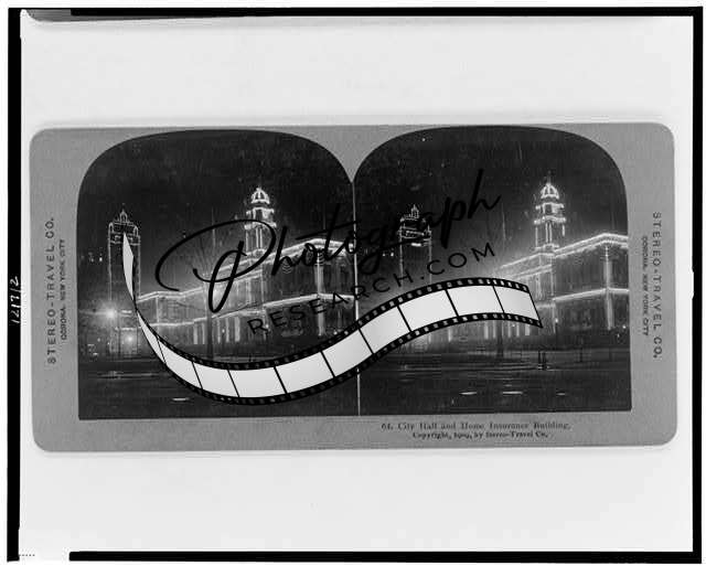 Photo of Stereograph,City Hall,Home Insurance Building,Illuminated,New York,1909