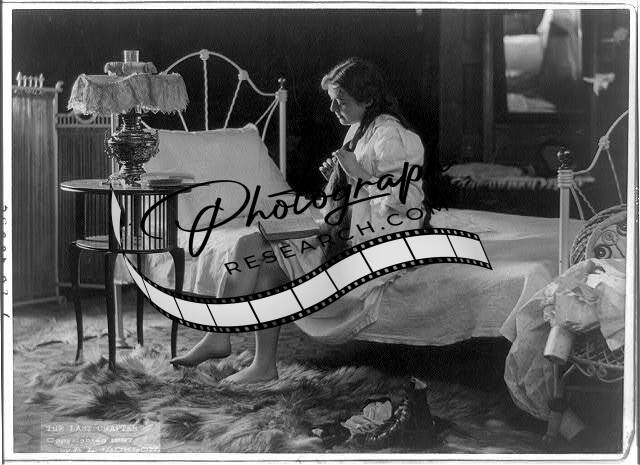 The Last Chapter,Young Woman,Long Hair,wearing nightgown,reading,bed,c1897
