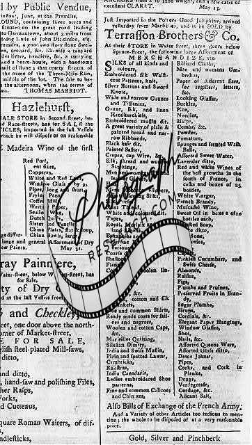 Advertisement - "Just ... arrived yesterday from Marseilles and to be sold by Terrason Brothers & Co... Water Street" (Phila.); list of merchandise