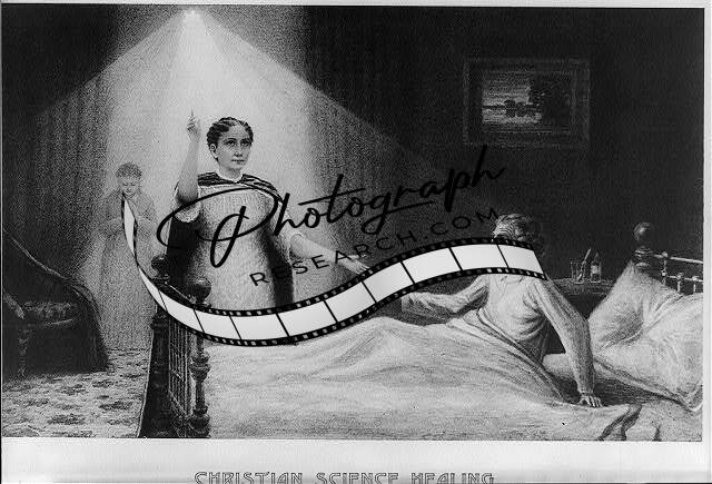 Christian Science healing,1893,Mary Baker Eddy standing over bed,elderly lady