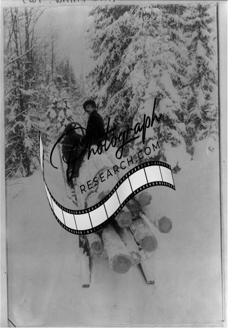 Man hauling spruce logs on horse drawn sled,Finland,Winter,1926,Trees