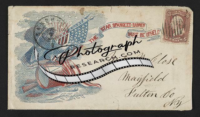 Title: [Civil War envelope showing American flags, eagle with laurel branches, and shield bearing message 'Union and liberty']