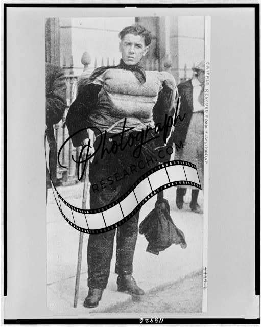 Cripple rescued,Lusitania,May 25,1915,man,life preserver,walking stick,steamship