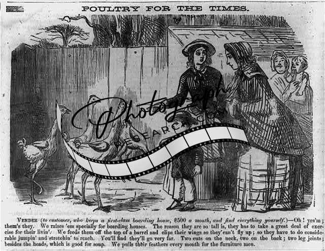 Poultry for the times,1863,Caricature,tall,scrawny turkeys,child,women