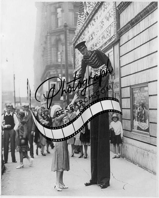 Ann Ludwig trying to shake hands with Harry Hart,stilt walker,Chicago,Illinois