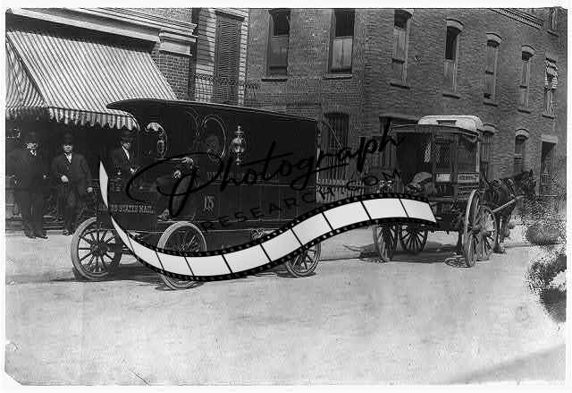 United States mail truck on street,horse-drawn carriage in back,men standing