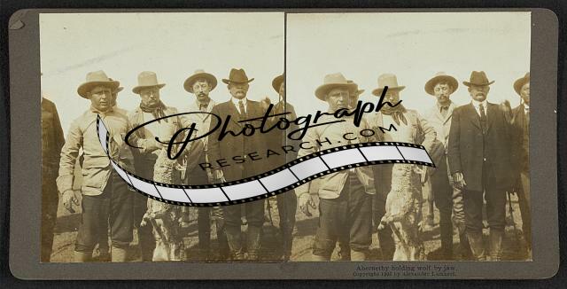 Photo of Stereograph,Abernathy holding wolf by jaw,Hunting,Theodore Roosevelt