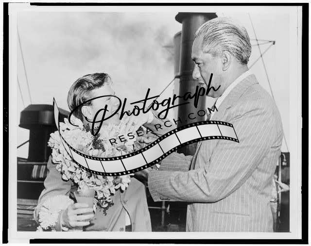 Sheriff Duke Kahanamoku of Honolulu swears in Mickey Rooney,adorned in leis,1941