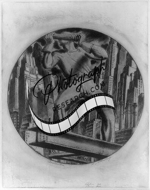 Construction, Riveter standing on girder amid skyscrapers. New York City.