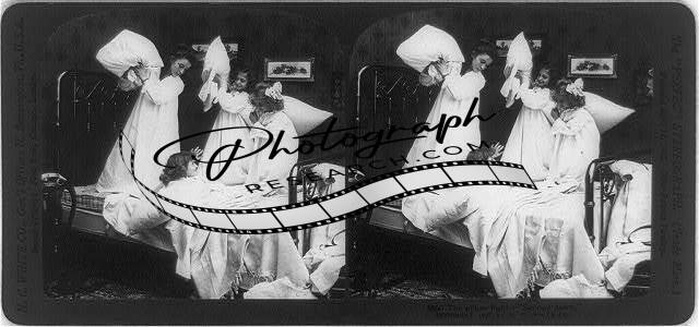 Photo of Stereograph,Pillow Fight,Second Down,Girls Playing,Bed,c1907,Children