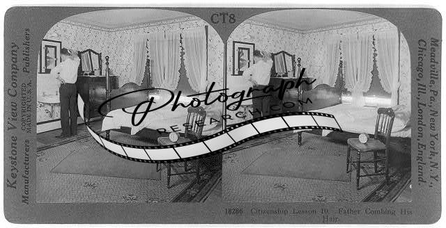 Photo of Stereograph,Citizenship Lessons,Father brushing his hair,c1929,bedroom
