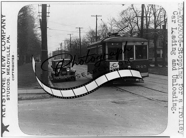 Stopping,trolley car loading,unloading,street railroad cars,Keystone View,c1930