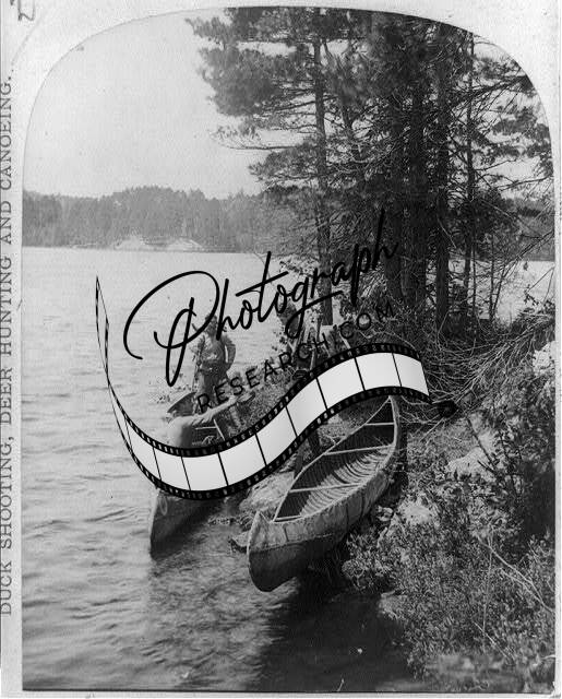 Three hunters,two canoes,shore,hunting,food,gathering,river,TW Ingersoll,c1890