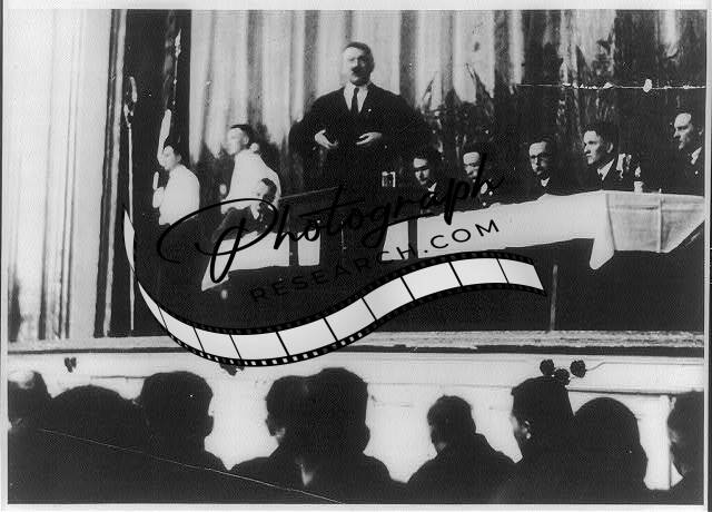 Adolf Hitler, three-quarter length portrait, standing in front of table at which approximately 7 are seated, elbows bent with hands in front of chest, facing right