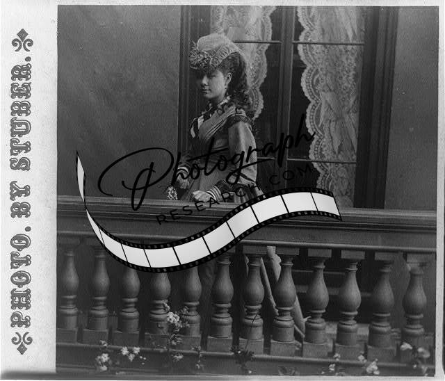 Ready for A Walk,Fashionably dressed young woman standing on balcony,c1871