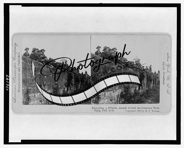 Photo of Stereograph,Expecting a Filipino Attack,Cemetery Wall,Pasig,Soldiers