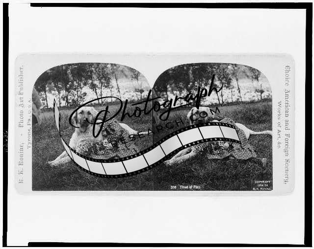Photo of Stereograph,Tired of Play,Little girl sleeping on pet dog,1895,Children