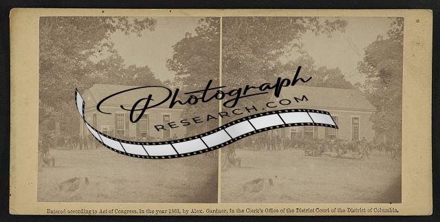 Summary: showing exterior view of a house surrounded by a few Union soldiers.