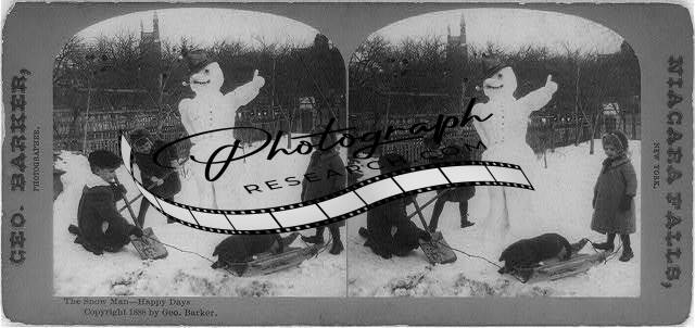 Photo of Stereograph,Snow Man,Happy Days,Children Playing,Small Sled,Cat,c1888
