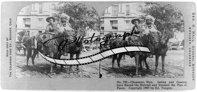 Photo of Stereograph,Cheyenne,Wyoming,Indian,Cowboy,Smoking Pipe of Peace,c1907