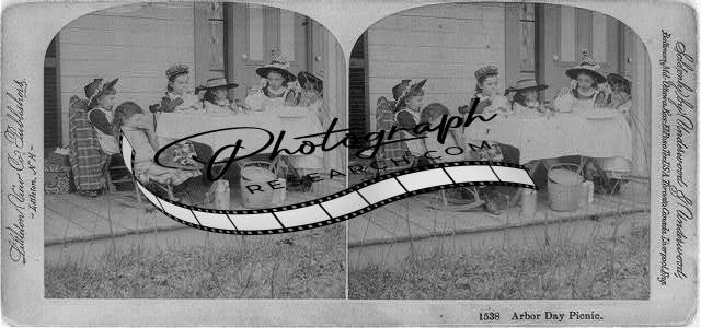Photo of Stereograph,Arbor Day Picnic,Children Eating,Table on Porch,c1891