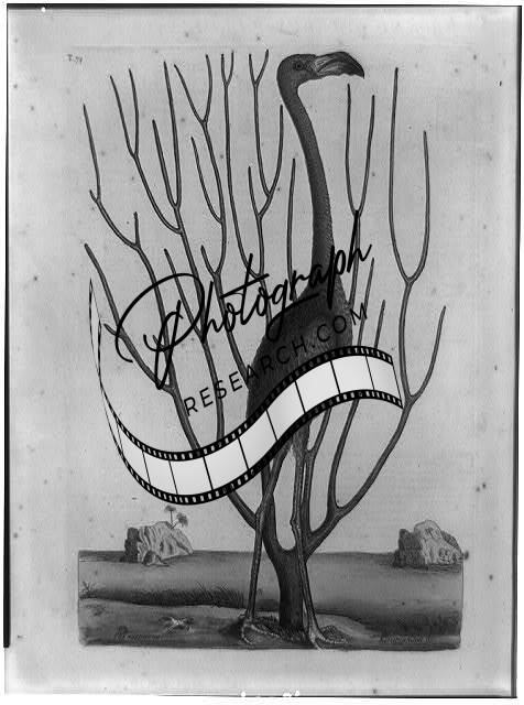 Flamingo against tree,tropical waterfront,birds,United States,Mark Catesby,1731