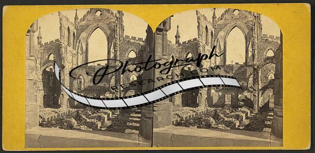 Summary: Stereograph shows an exterior view of the destroyed buidlings of the Circular Church.