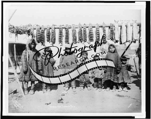 Under the Salmon Row,c1906,Eskimo children,Alaska,AK,Fish Drying,hanging rack