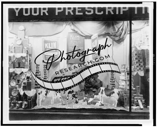 Alarm clock,powdered milk,toothpaste,drugstore display window,Washington DC,1909