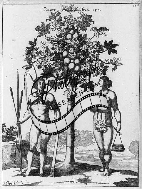 Naked Indians standing beneath papaya tree,French West Indies,Fruit