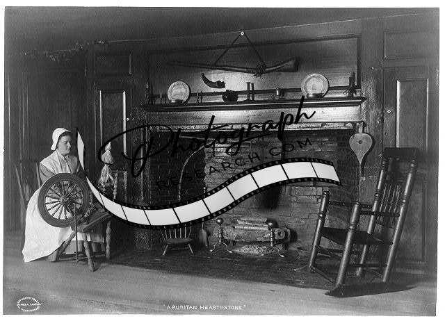 A Puritan Hearthstone,c1906,Woman,Spinning Wheel,Fireplace,Rocking Chair