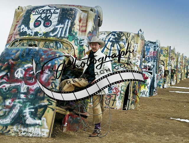 Cowboy at Funky Cadillac Ranch,U.S. Route 66,Amarillo,Texas,TX,Automobiles